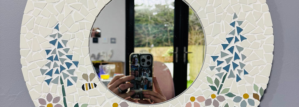 available dates 13th March 2026 Saturday 16th May Full day mosaic workshop. £120pp For half day workshops see book online page. Option 1 -40cm wall mirror Option 2- 30cm Wall clock If you would like to do a larger house name plaque , contact me to discuss options. In this full day workshop, you can follow one of my designs or come up with your own design, to create a beautiful mosaic mirror or wall clock . Suitable for complete beginners. I have a large stock of hand cut by me tiles, so you can recreate my design even if you don’t wish to do the cutting part to this workshop. My floral mosaic workshops use the highest quality porcelain tiles, the unglazed pastel tones give a contemporary finished piece of mosaic art. In my mosaic workshops you will learn how to cut and shape your tiles to create a stunning piece of floral mosaic art. Grouting cannot take place until the glue has set your tiles, around 24 hours. I have two grouting options with this workshop both INCLUDED in your workshop price. Option 1- I can grout your work for you Option 2- you can take home everything you need to grout your work and my instruction tutorial video to follow. This workshop is for adults due to the cutting of tiles, however if you have a teenager you’d like to attend with you on the course it is at your own discretion, if you have any questions please get in touch. You will find my open booking dates online, however if you’d like to book a private workshop with friends just get in touch. I can do minimum of 5 people for weekday private bookings, and minimum of 8 people for weekend private bookings. Included in your workshop price is tea , coffee, soft drinks and Prosecco! a selection of yummy snacks and a light lunch for full day workshops. 50% deposit required on booking, remainder due at the workshop. If you need to cancel your booking, the deposit is refundable if cancelled up to two weeks before the event; 2 weeks- 48 hours you can use your deposit to reschedule another workshop; less than 48 hours notice is non refundable. If a scheduled workshop does not meet the minimum bookings and has to be cancelled, you will be refunded in full. All scheduled workshops are ran from the studio located at The Old Linhay, Halberton Road, Willand, Devon, EX15 2QF.